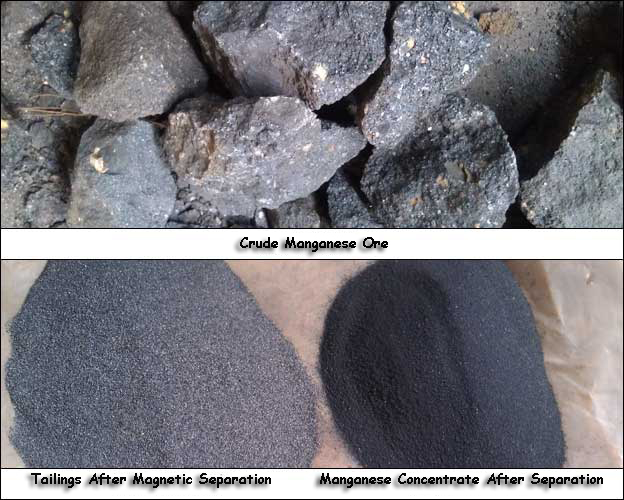 The following picture is about manganese ore test. This manganese ore is hard to upgrade by gravity separation and magnetic separation can be used to get ideal beneficiation efficiency. The upper one is the raw manganese ore, the bottom left picture is the tailings after magnetic separation while the bottom right one is about the manganese concentrate after intensity magnetic separation: